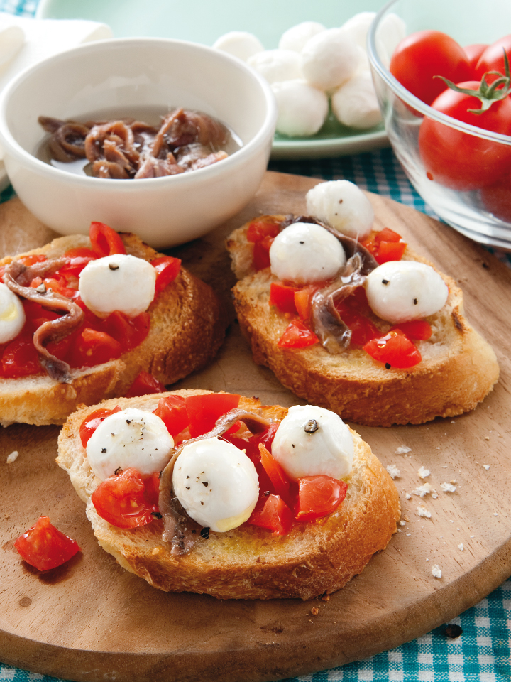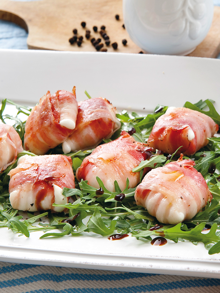 Talianske mozzarellové guľôčky so slaninou pancetta na lôžku z rokety