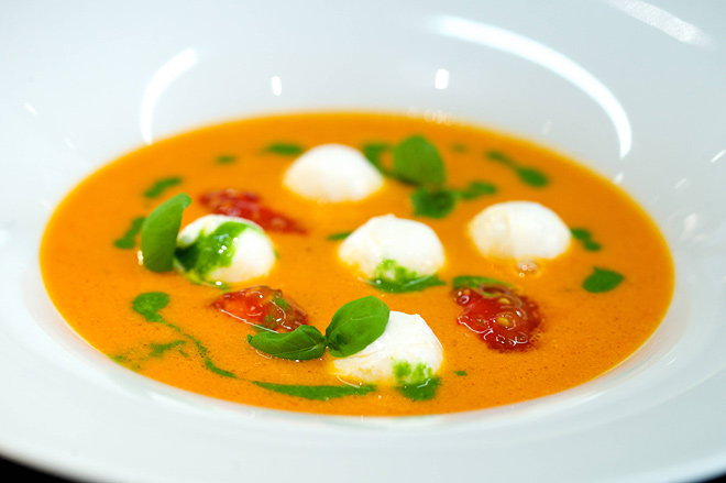 Paradajková polievka s pečenými paprikami, mini mozzarellou a bazalkou
