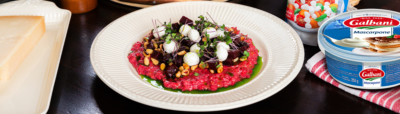 3. Potom postupne prilievajte 500 ml zeleninového vývaru a za občasného miešania varte na miernom ohni približne 14 minút, až kým bude ryža takmer mäkká. Nakoniec vmiešajte pyré z červenej repy, 250 g Galbani Mascarpone, 80 g najemno nastrúhaného parmezánu a zvyšok olivového oleja.